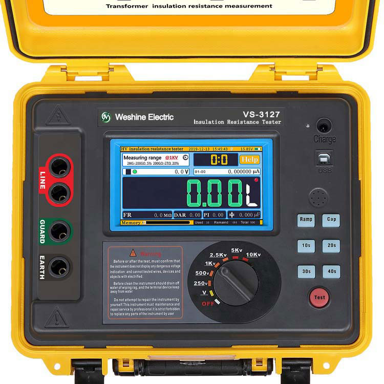 VS-3127 A VS-3127Megohm mérő tesztpontos szigetelési ellenállásméréseket kínál 15 kV tesztfeszültségig, 30 TΩ maximális ellenállással. Az ellenállásmérés pontossága ± 5 % 1 MΩ és 3 TΩ között! A közüzemi és szolgáltató cégek számára a VS-3127 egy mindenre kiterjedő tesztelő, rugalmasságával és jövőbeli ellenőrzési képességével. A Weshine VS-3127-et úgy tervezték, hogy bárhol is működjön, ahol dolgozik. A maximális névleges kimeneti feszültség elérheti a 7 fokozatot (250Vï¼500Vï¼1KVï¼2,5KVï¼5KVï¼10KVï¼15KV). Max. rövidzárlati áram 7mA Szigetelési ellenállás teszt (IR), polarizációs index tesztï¼PI, dielektromos abszorpciós arány teszt (DAR). Rámpateszt mód (RAMP), szűrt ellenállásteszt mód (FR). *Kapacitásteszt (Cap.). Feszültségfigyelő funkció, automatikusan figyeli a mért feszültséget